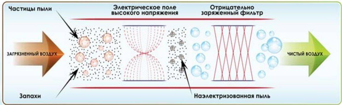 - на пыль и микроорганизмы воздействует электрическое поле, образуемое ионизирующими электродами под высоким напряжением;