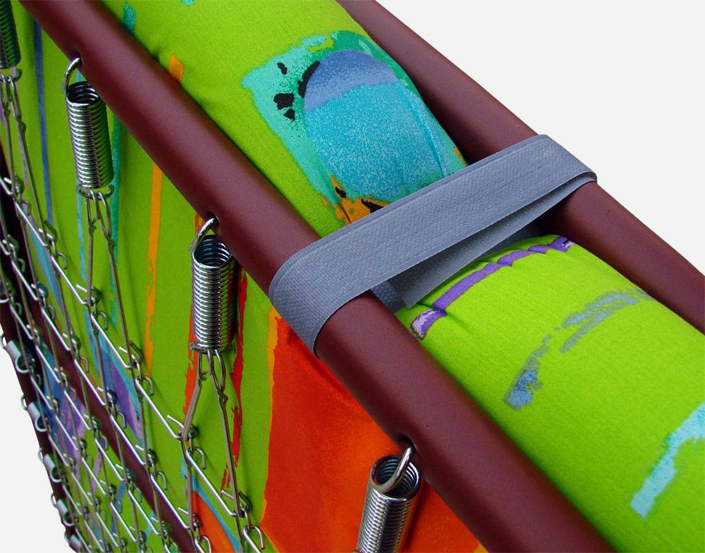 Да-да, почти “те самые”. Плотная износостойкая ткань для кемпинговой мебели(обычно полипропиленовая ткань), натянутая по периметру пружинами. Но на надёжном стальном каркасе!