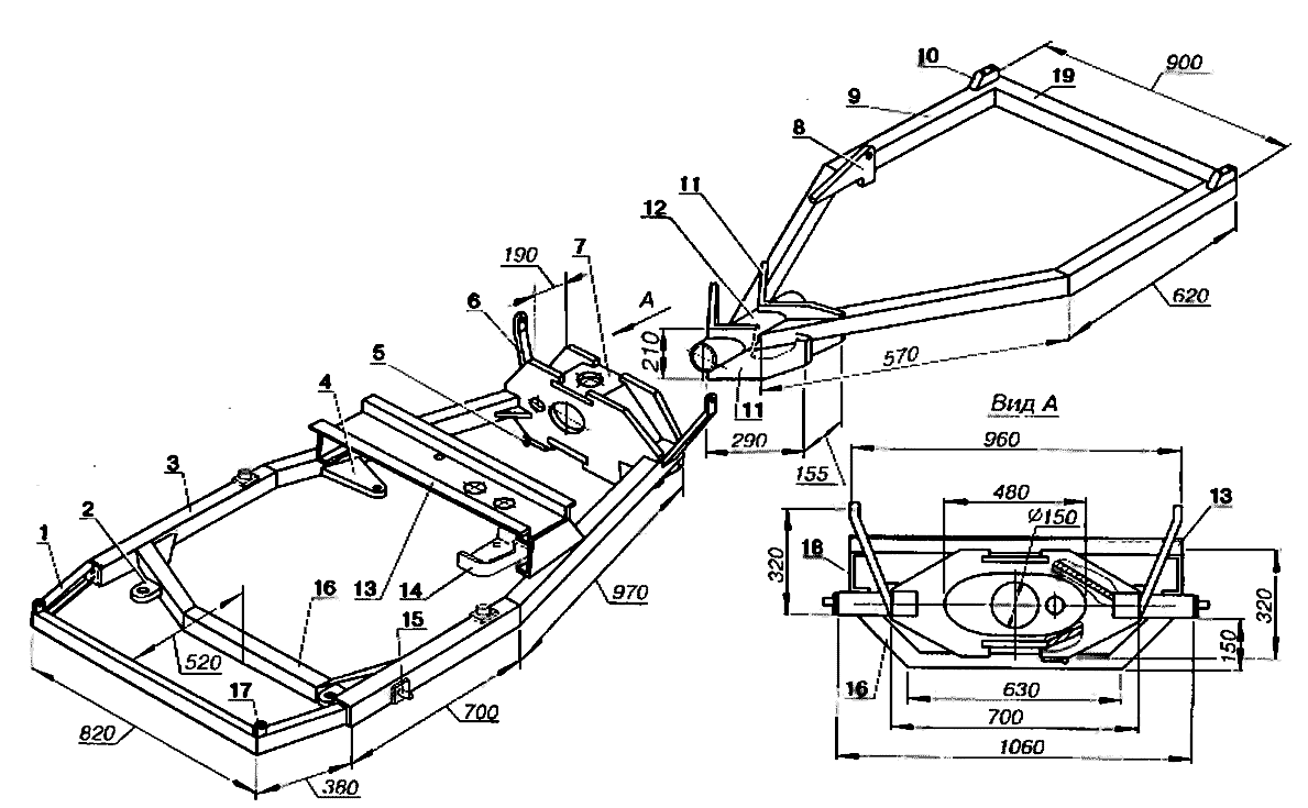 Рамы изготавливаются размерами 40х40 см, но в случае необходимости эти размеры уменьшают или увеличивают. К заднему концу рамы при помощи сварки прикрепляют швеллер, а боковые трубы соединяют друг с другом болтами. Также на раму устанавливают рычаг. Для увеличения силы регулировки устанавливают дополнительный рычаг длиной 75 см.