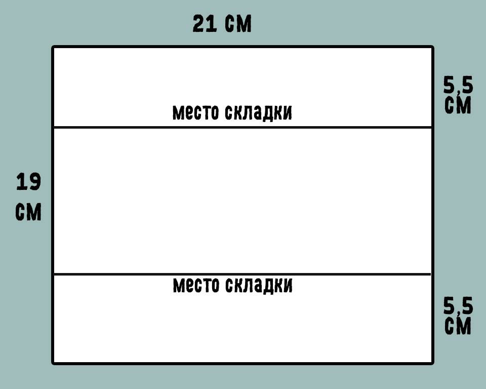 Шаг 1. Сделайте выкройку: нарисуйте на обычной бумаге прямоугольник 15х12 см, а поперек него проведите прямую линию. На нижнем и верхнем краях поставьте метки на расстоянии 3,5 см от края слева. Также сделайте несколько меток справа на расстоянии 4,5 см от верхнего края и 3,5 см — от нижнего. Соедините точки. Должна получиться фигура, как на рисунке. Ее нужно вырезать.