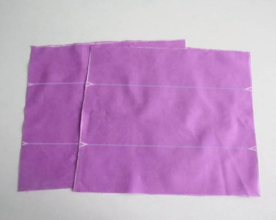 Шаг 8. Сложите заготовки вместе. Первая — самая большая, это перед. Далее верхнюю маленькую совместите с первой лицевыми сторонами внутрь. И также приложите нижнюю маленькую к передней заготовке. Зафиксируйте все зажимами.