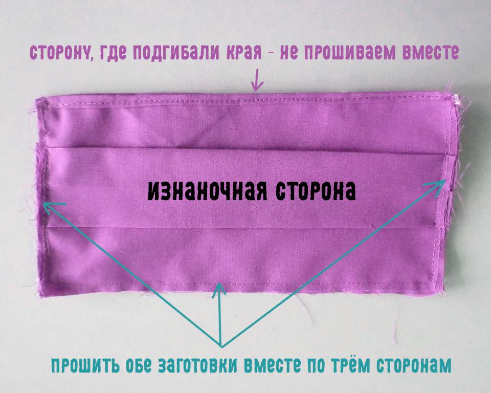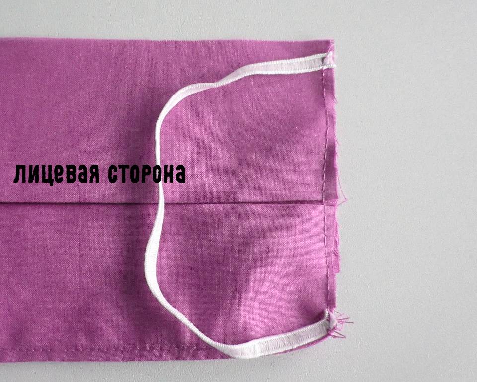 Затем получившийся прямоугольник надо снова расположить швом посередине, продеть по краям резинки либо тесёмки и прошить вдоль них. Маска готова! А благодаря «плавающему» креплению резинок при затягивании она будет максимально анатомично принимать форму лица.