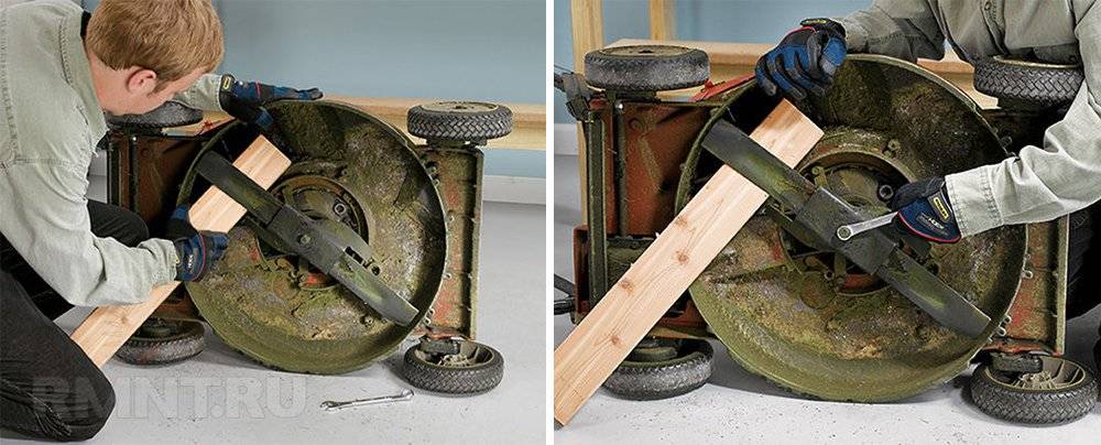 - Перед тем, как снять нож с газонокосилки, его фиксируют крепкой доской или поленом, упертым в землю. Необходимо, чтобы нож, когда его будут снимать, не двигался. Однако некоторые этой мерой безопасности пренебрегают и просто придерживают режущую пластину рукой.