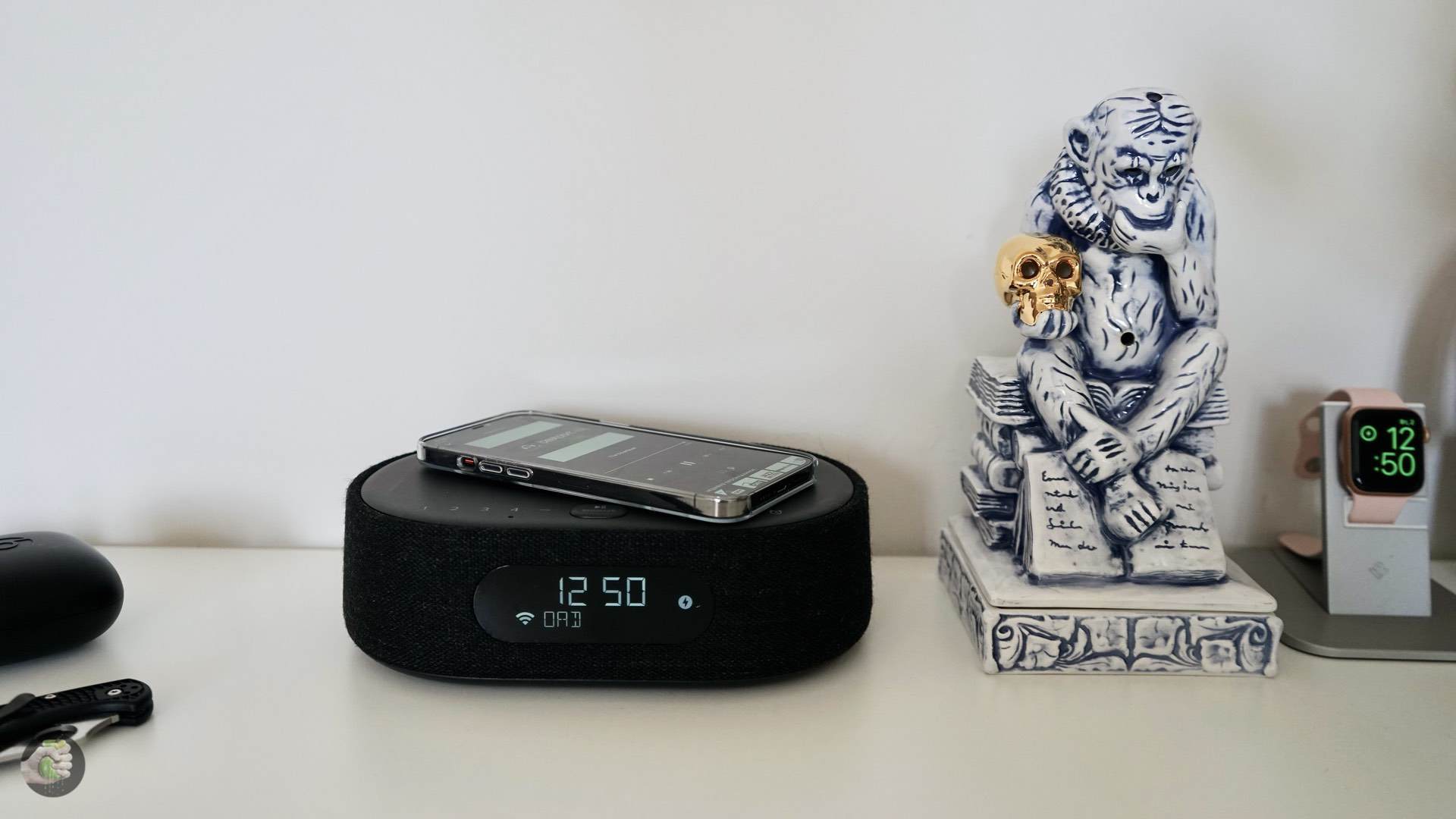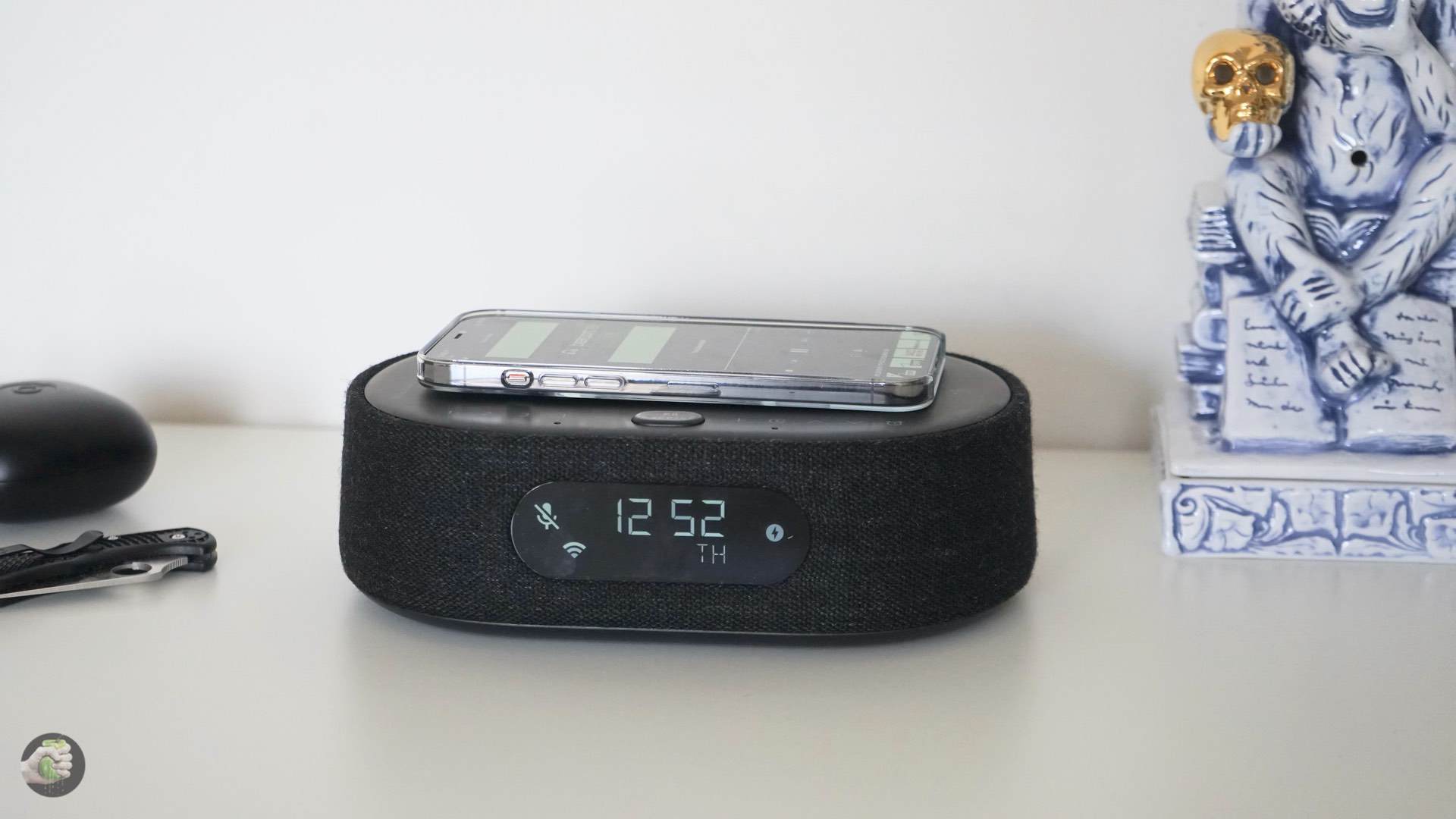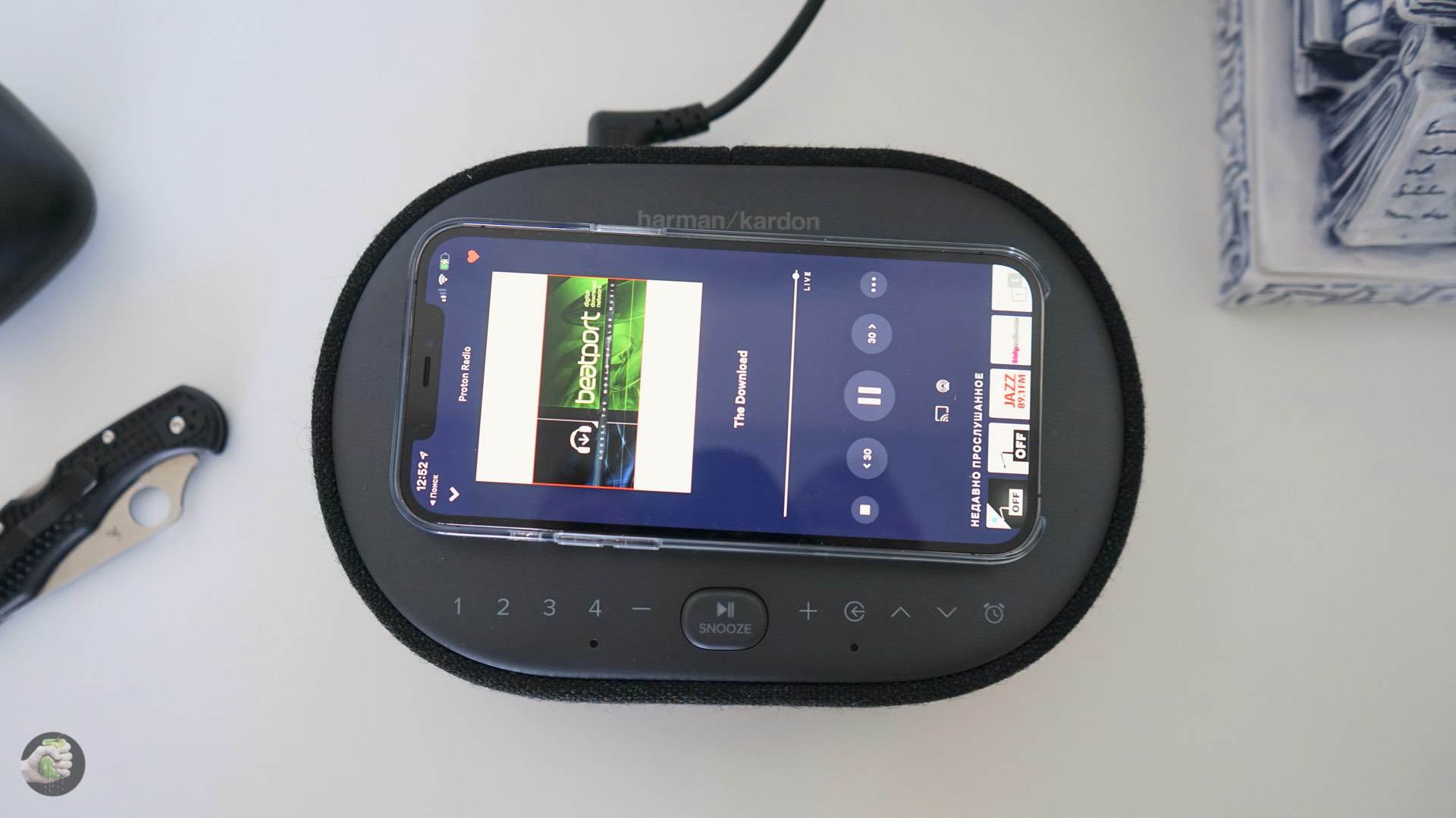 Сверху беспроводная зарядка, нужно чуть приноровиться правильно укладывать смартфон. Зато никаких кабелей. Кнопки сенсорные, кроме Play/Snooze. Напомню, Snooze помогает поставить будильник на паузу — я сомневаюсь, что кто-то будем им пользоваться, но мало ли.