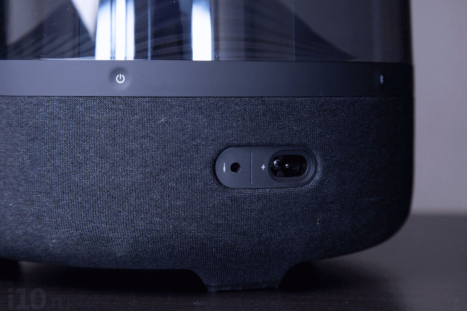 На обратной стороне Harman Kardon Invoke находится кнопка микрофона, а также переключатель Bluetooth. В нижней части подключается источник питания, здесь находится порт micro USB, который предназначен для обслуживания, заряжать колонку через MicroUSB, к сожалению, нельзя. В любом случае оборудование хорошо работает как через Bluetooth, так и Wi-Fi.